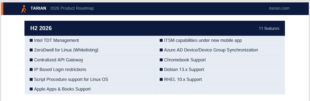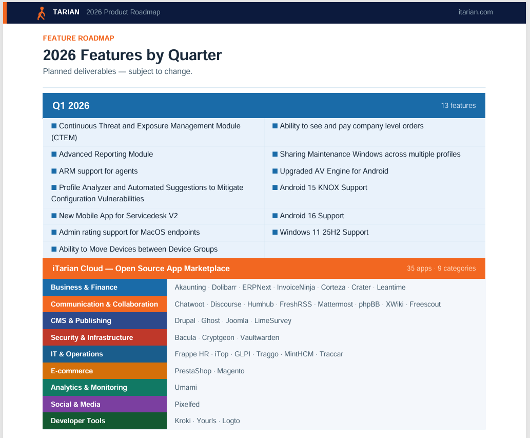 2026 is a big year for us. iTarian already gives you a powerful, unified platform — RMM, endpoint security, MDM, ticketing, remote access, and more. This year we’re focused on making it significantly deeper, smarter, and more capable across every one of those areas.